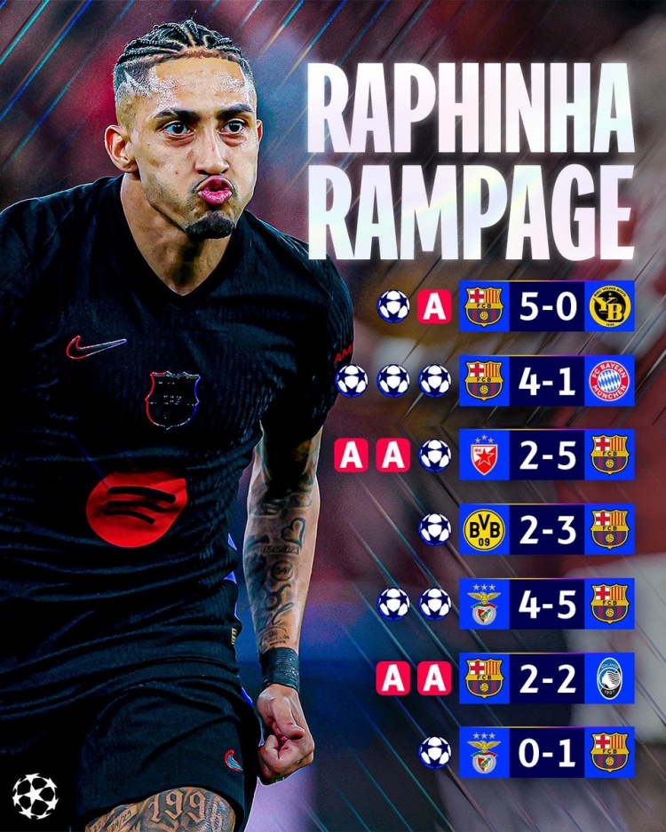 歐冠官方數(shù)據(jù)統(tǒng)計顯示,拉菲尼亞本賽季在9場歐冠有7場能夠直接參與進(jìn)球,貢獻(xiàn)9球5助攻: