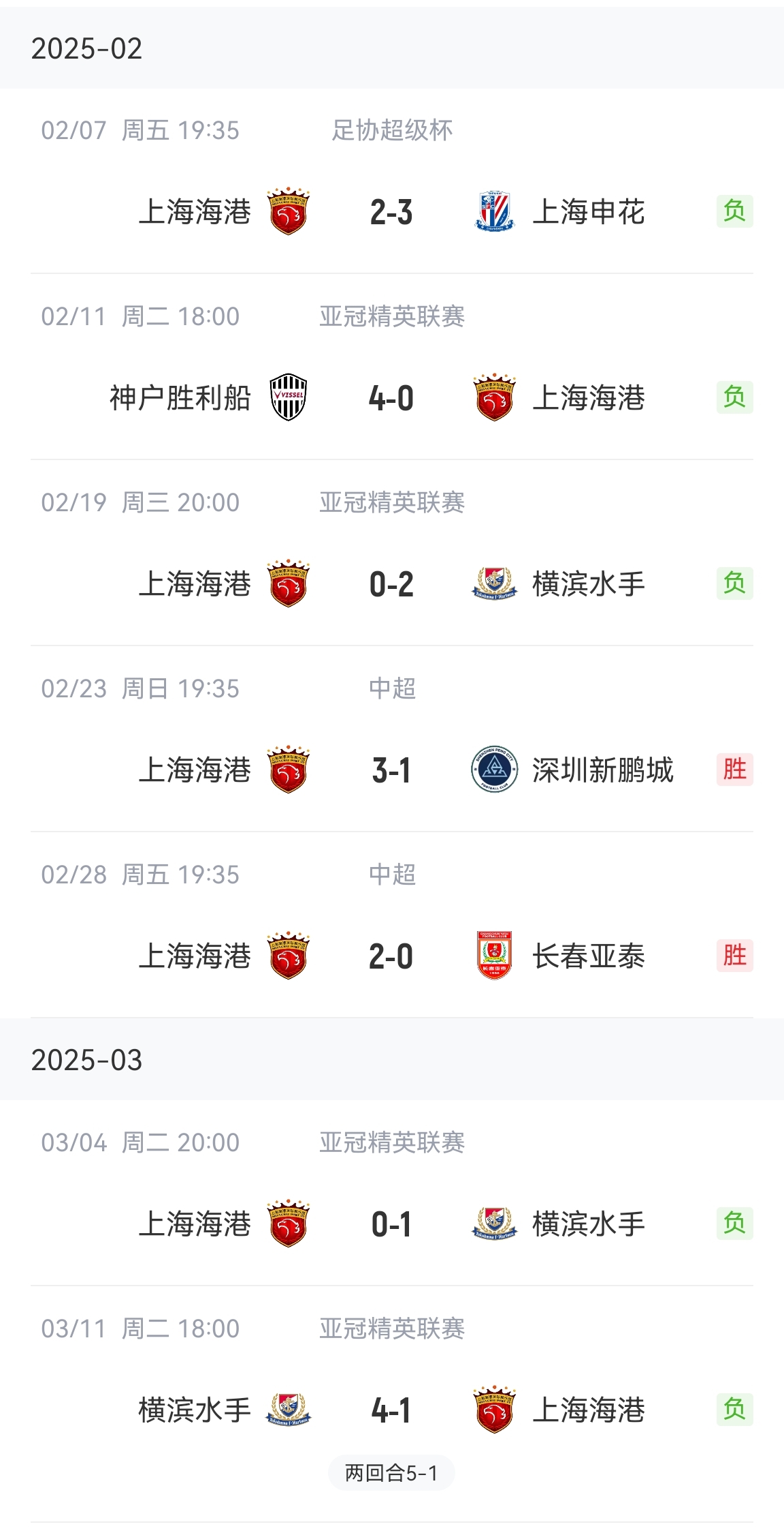 2025年海港超級(jí)杯2-3遭申花逆轉(zhuǎn),亞冠4場(chǎng)全敗,聯(lián)賽則取得了兩連勝。