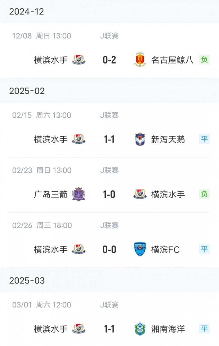 數(shù)據(jù)顯示,本賽季J聯(lián)賽戰(zhàn)罷5輪,橫濱水手還未嘗勝績,4輪聯(lián)賽(橫濱少賽一場)僅3平1負(fù)打進(jìn)2球,目前積3分排在J聯(lián)賽積分榜第18位。而算上上賽季的話,橫濱水手在J聯(lián)賽已經(jīng)連續(xù)5場不勝(3平2負(fù)打進(jìn)2球丟掉5球)。