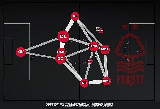 穆里略和米倫科維奇配合默契,埃蘭加和奧多伊可以深度退守保護(hù)邊后衛(wèi),克里斯-伍德總是在不停干擾對手的傳遞,吉布斯-懷特甚至能夠來到中衛(wèi)身前扮演清道夫……諾丁漢森林擁有正面防守能力出眾的中衛(wèi)組合,他們身邊聚集了多名柔韌性出眾、腳下纏斗能力強(qiáng)且愿意防守的攻擊手。努諾-桑托的球隊(duì)防守時頗具拉丁風(fēng)味,依靠錯落有致的三線結(jié)構(gòu)堵塞禁區(qū)空間,就是他們的招牌動作。