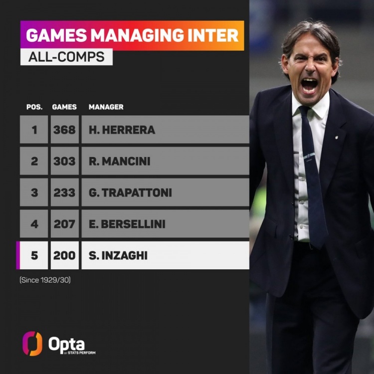 數(shù)據(jù)統(tǒng)計顯示,他也是1929-30賽季有統(tǒng)計以來第5位達(dá)成此成就的國米主帥。