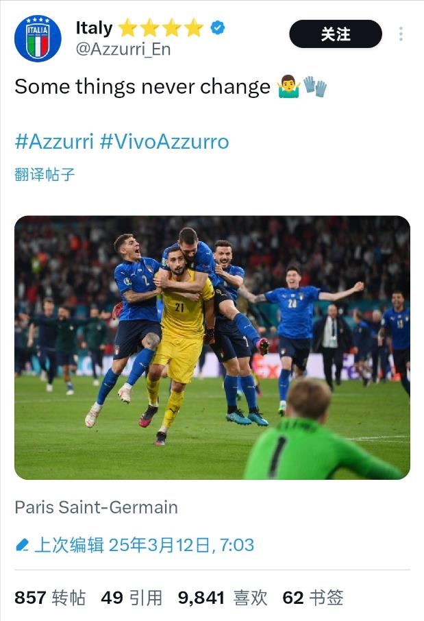賽后,意大利國家隊官推曬出了2020歐洲杯決賽多納魯馬撲出決勝點球的瞬間,并寫道:“有些事情永遠都不會改變”。當時意大利隊與東道主英格蘭隊在決賽戰(zhàn)至點球大戰(zhàn),三獅軍團第4、5順位出場的桑喬和薩卡的點球都被多納魯馬擋出,英格蘭隊無緣隊史首座歐洲杯冠軍。繼那屆歐洲杯之后,多納魯馬再次給英格蘭足球送上一記“重擊”。