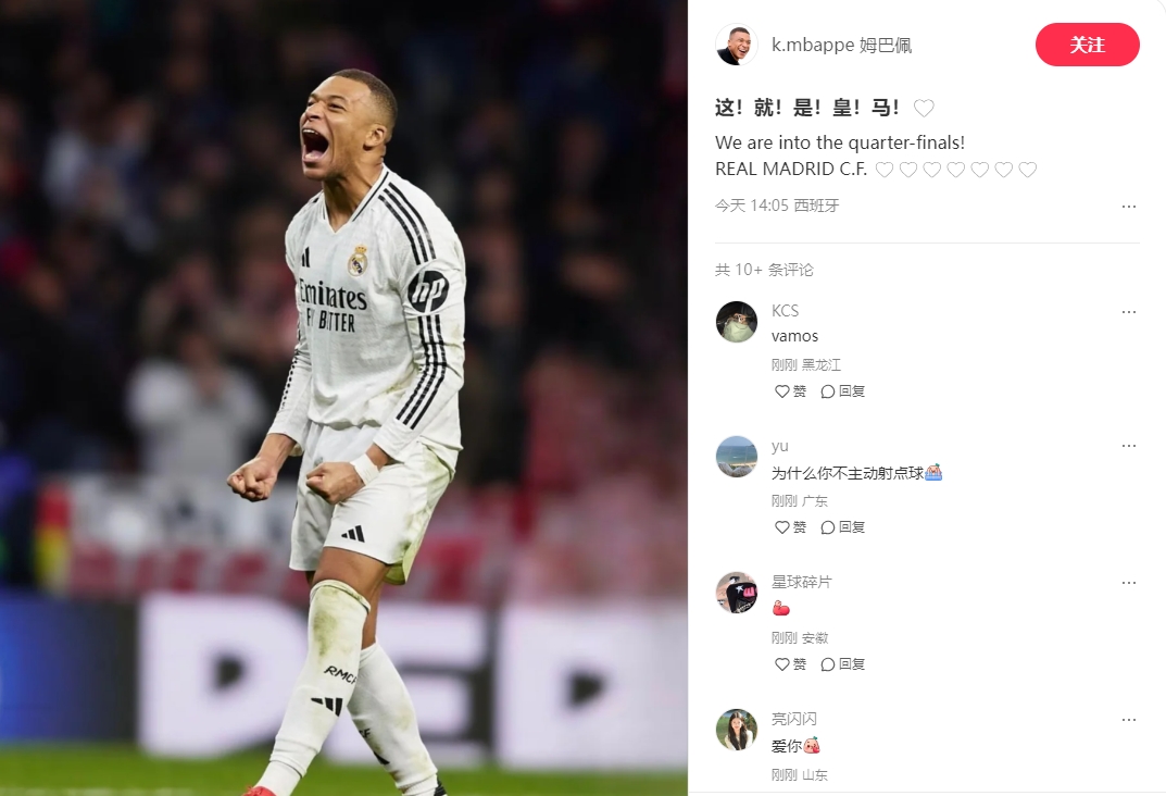 姆巴佩更新小紅書寫道:這!就!是!皇!馬!
