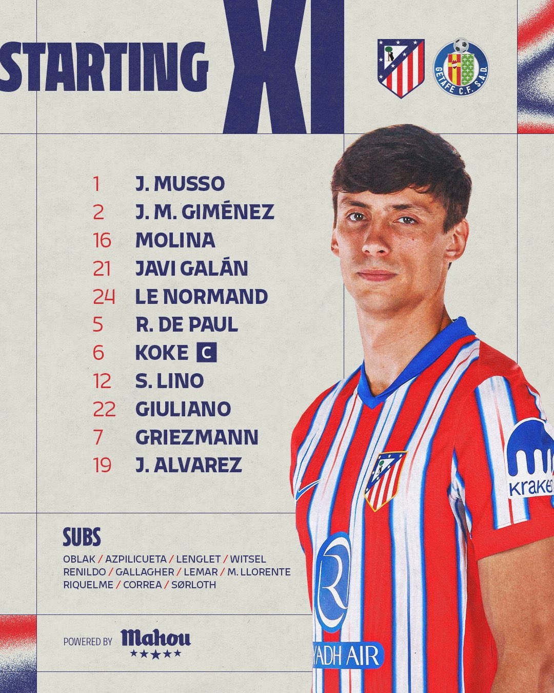 馬競首發(fā):1-穆索、2-吉梅內(nèi)斯、16-莫利納、21-加蘭、24-勒諾爾芒、5-德保羅、6-科克、12-利諾、22-朱利亞諾-西蒙尼、7-格列茲曼、19-阿爾瓦雷斯