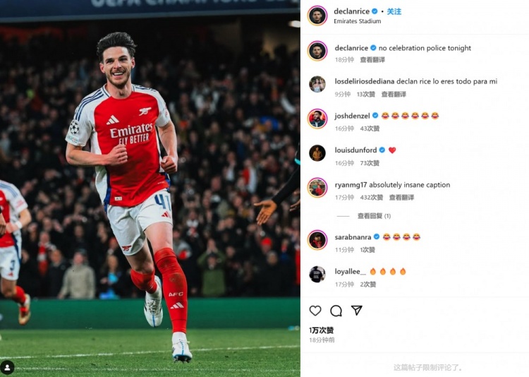 賴斯也在賽后通過社媒曬出自己進(jìn)球后的慶祝照,并調(diào)侃:“今晚沒有慶祝動作的道德警察。”