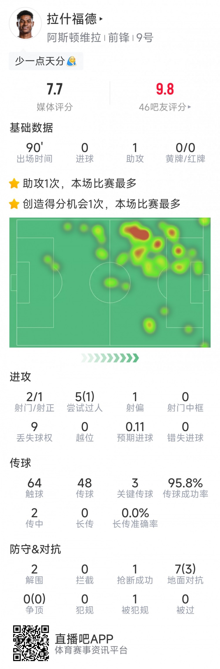 3月13日訊 在本輪歐冠,維拉3-0擊敗布魯日。本場比賽拉什福德送出助攻,以下為他在本場數(shù)據(jù):