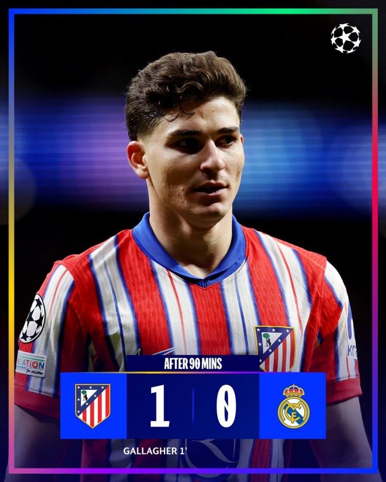 第1分鐘,馬競反擊,德保羅分邊,西蒙尼右路傳中,前點一漏,加拉格爾門前鏟射破門,馬競?cè)〉脡艋瞄_局,1-0!↓