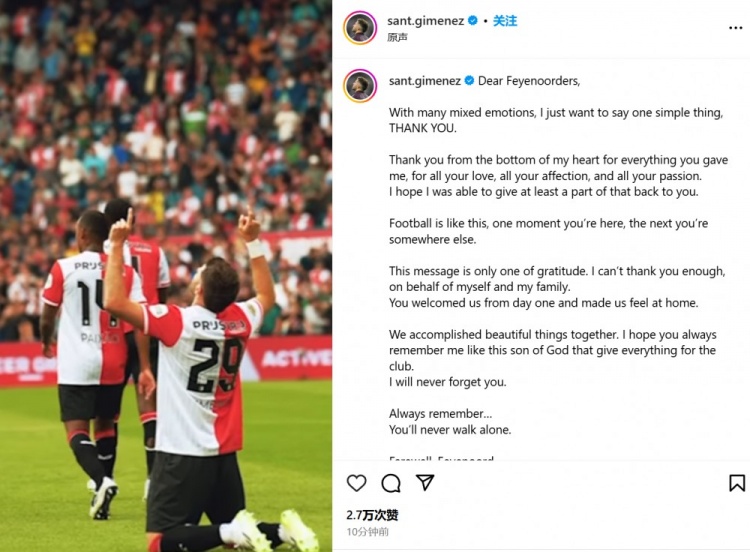“一如既往,你永遠不會獨行。再見費耶諾德,我會把你們永遠珍藏在心。愛你們的,圣地亞哥?!?/p>