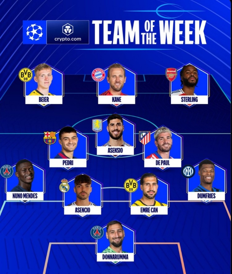 3月14日訊 本輪歐冠戰(zhàn)罷,歐冠官方也評選出本輪比賽最佳陣容,凱恩、佩德里領(lǐng)銜,具體陣容如下: