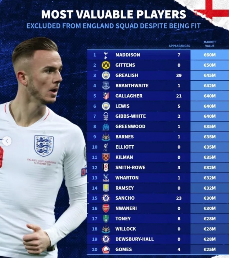 德轉(zhuǎn)列落選英格蘭隊的健康球員身價榜:歐元(及生涯國家隊出場數(shù))