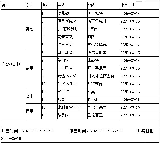 本周末的 傳足勝負(fù)彩第25041期中不乏焦點(diǎn):英超,曼城主場對(duì)陣布賴頓;德甲,拜仁慕尼黑客場出征柏林;意甲,AC米蘭主場迎戰(zhàn)科莫;西甲,皇馬做客對(duì)壘比利亞雷亞爾。