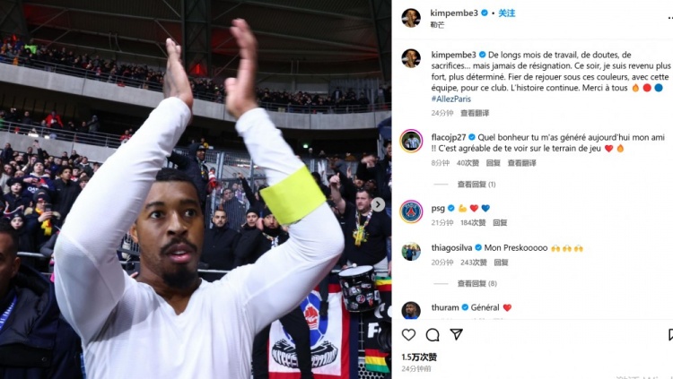 2月5日訊 巴黎在本輪法國杯2-0擊敗勒芒,29歲的中衛(wèi)金彭貝時(shí)隔2年終于復(fù)出。