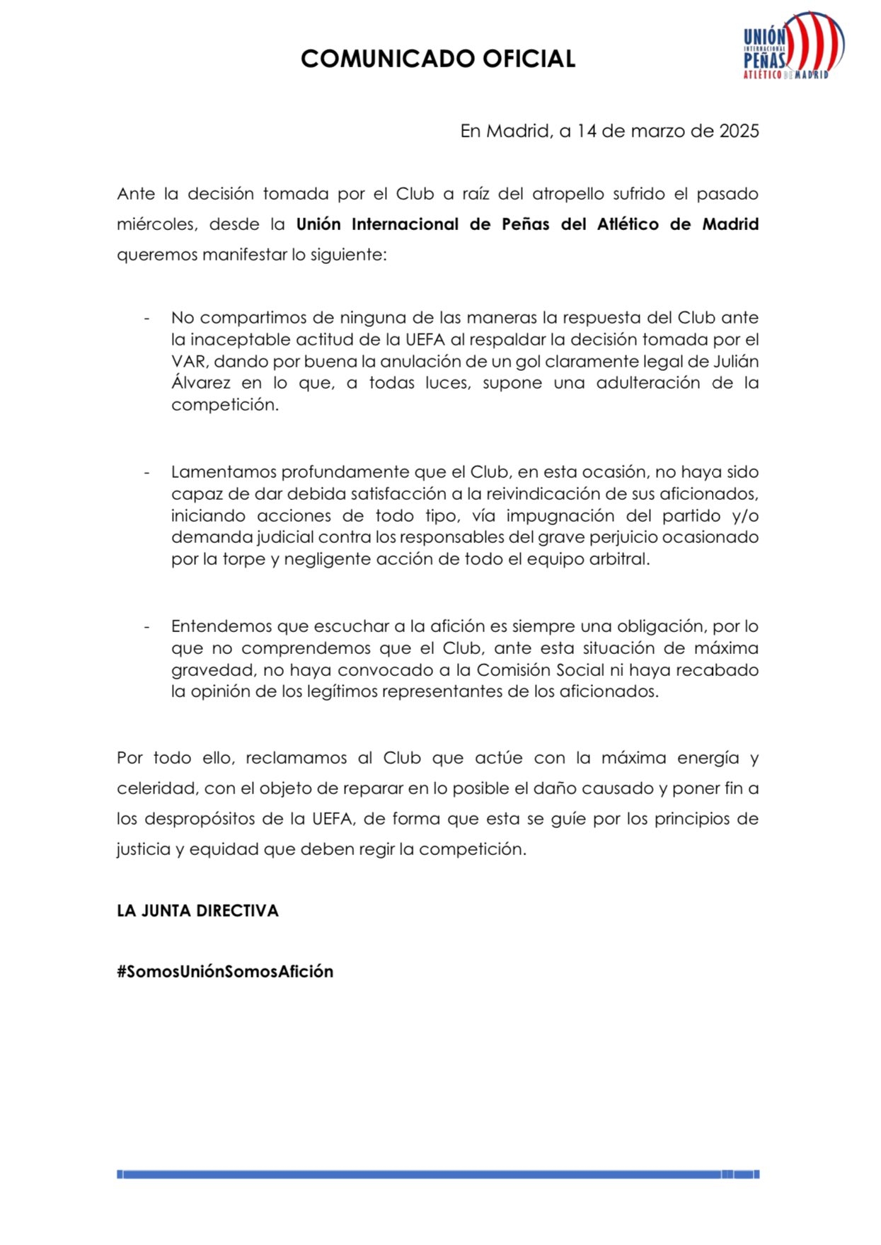 鑒于俱樂部因上周三發(fā)生的事件所做出的決定,馬德里競技國際球迷會聯(lián)盟希望表達(dá)以下立場: