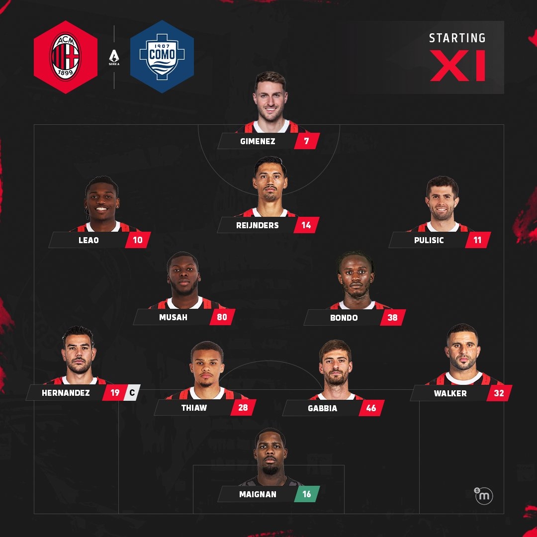 AC米蘭首發(fā):16-邁尼昂、32-沃克、46-加比亞、28-佳夫、19-特奧、38-邦多、80-穆薩、14-賴因德斯、11-普利西奇、10-萊奧、7-圣地亞哥-希門尼斯