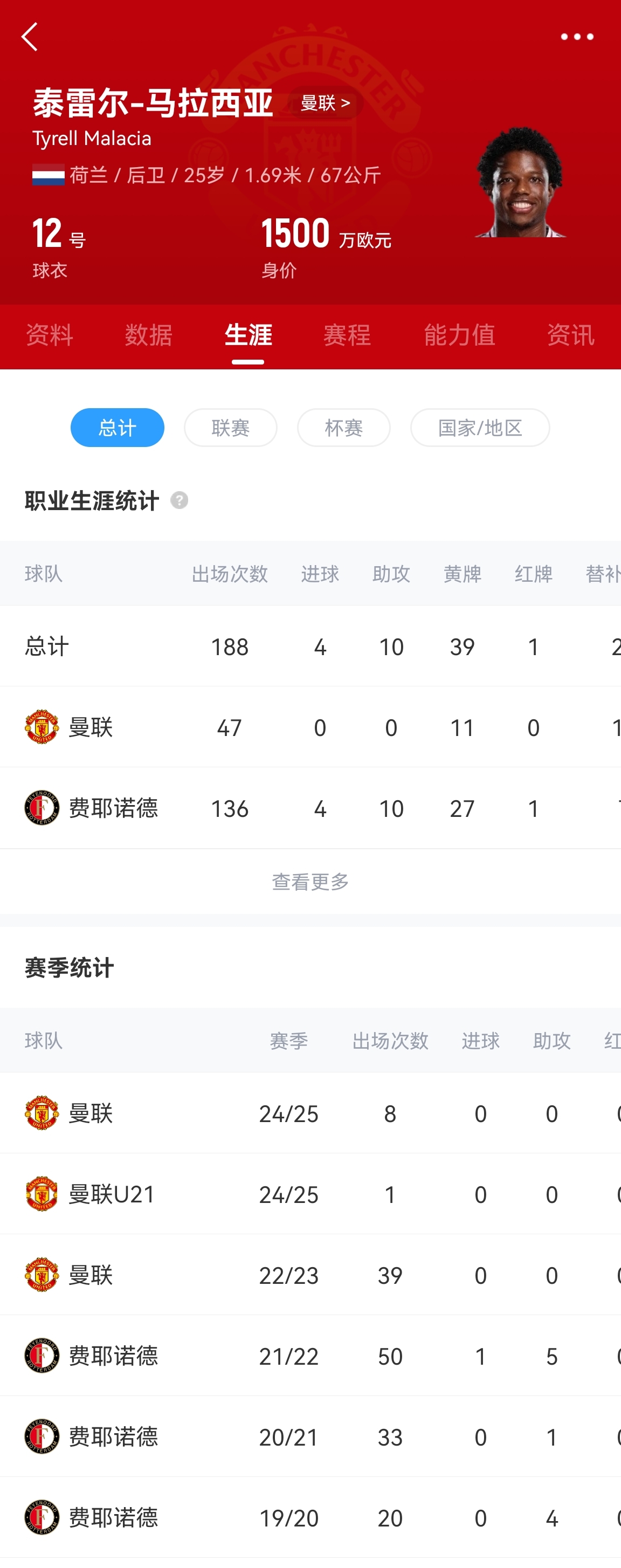 馬拉西亞是滕哈赫執(zhí)教期間1500萬歐元從費耶諾德簽下的,但加盟以后受傷病和適應(yīng)問題的困擾,2年半總共只為曼聯(lián)出場47次。