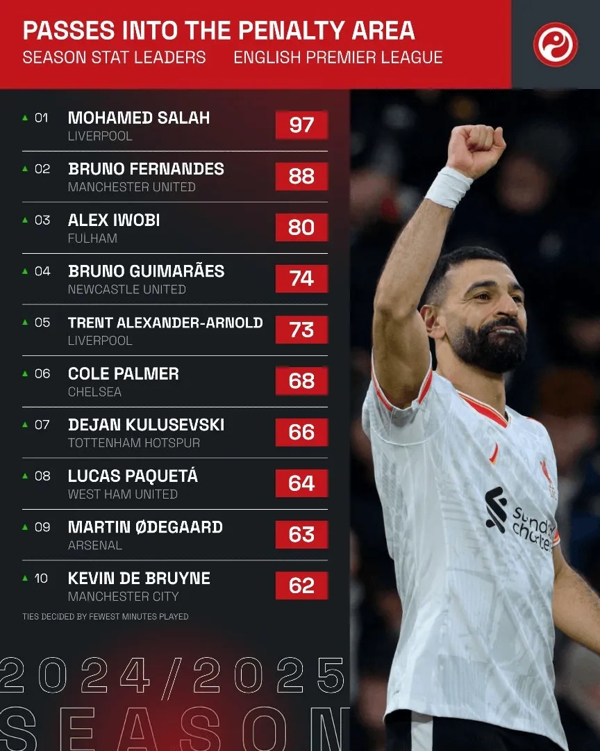 2月5日訊 squakwa統(tǒng)計了本賽季英超球員傳球進(jìn)入禁區(qū)次數(shù)情況,薩拉赫力壓B費居首。