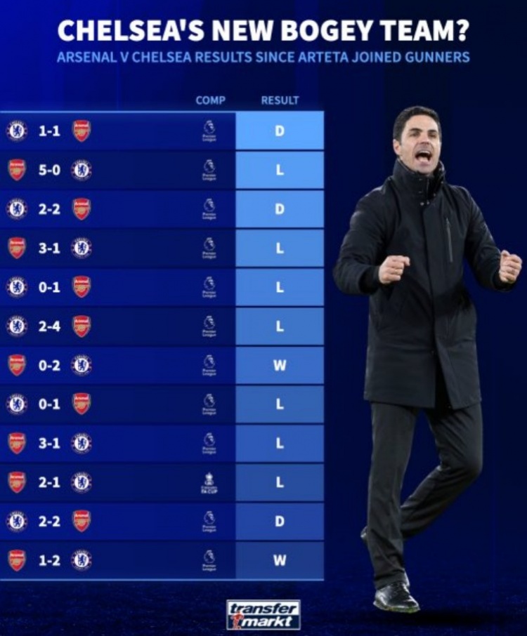 據(jù)統(tǒng)計(jì),在阿爾特塔執(zhí)教阿森納以來(lái),球隊(duì)在各項(xiàng)賽事共12次與切爾西交鋒,戰(zhàn)績(jī)?yōu)?勝3平2負(fù),其中近6場(chǎng)比賽4勝2平保持不敗。