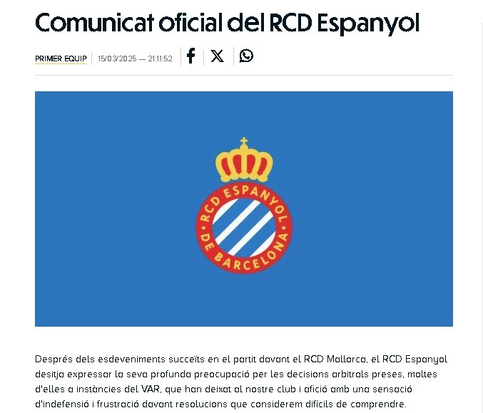 對陣馬洛卡的比賽后,西班牙人足球俱樂部對多項裁判判罰表達深切憂慮,尤其是在VAR干預下做出的決定,這些難以理解的判罰讓俱樂部和球迷感到無助與沮喪。