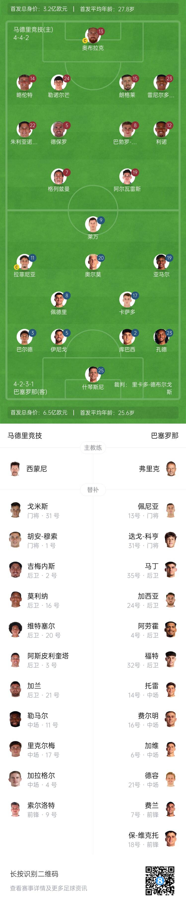 巴薩首發(fā):25-什琴斯尼、23-孔德、2-庫(kù)巴西、5-伊尼戈-馬丁內(nèi)斯、3-巴爾德、17-卡薩多、8-佩德里、20-奧爾莫、19-亞馬爾、11-拉菲尼亞、9-萊萬(wàn)