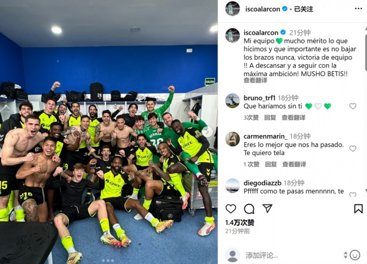 本場比賽伊斯科點射破門拉響反擊號角,賽后伊斯科也在社媒曬出更衣室內(nèi)全隊球員慶祝合影,配文寫道:“我的球隊????我們做到的事情值得被認可,永不放棄太重要了。這是一場團隊的勝利,現(xiàn)在是時候休息調(diào)整,以最高昂的斗志繼續(xù)前進。貝蒂斯加油!”