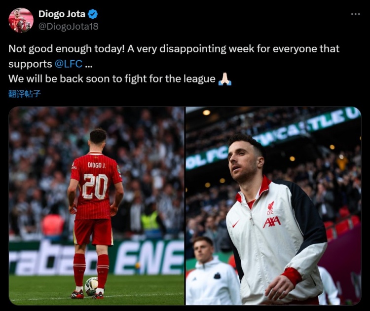3月17日訊 利物浦在聯(lián)賽杯決賽1-2不敵紐卡,若塔在賽后通過社媒發(fā)文。