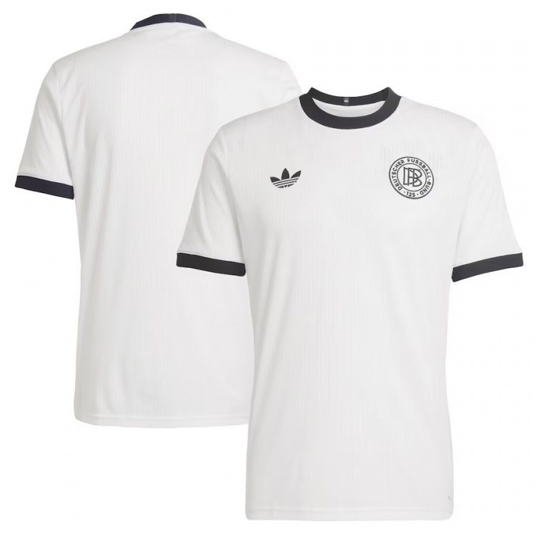 紀念球衣的設計以1974年復古球衣為藍本——這一年,德國男足國家隊在本土贏得了世界杯冠軍。125周年紀念球衣的配色和剪裁均承載著德國足協(xié)的歷史:球員版球衣采用經典的黑白配色,而守門員球衣則為淡藍色。球衣采用細條紋面料,搭配袖口、圓領衣領以及衣領后方的旗幟印花。球衣胸前繡有阿迪達斯的三葉草標志,以及特別為德國足協(xié)成立125周年設計的刺繡徽章,而該徽章的涉及靈感來自德國足協(xié)在萊比錫成立地所懸掛的紀念牌匾。