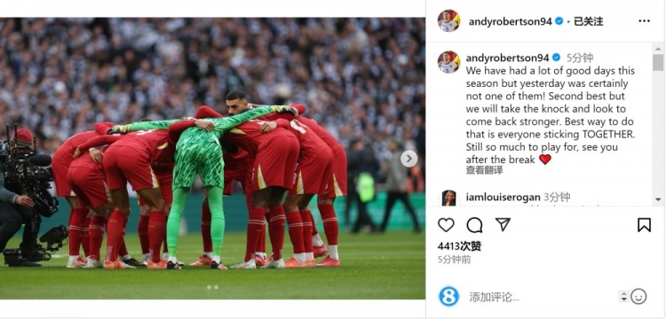 羅伯遜在社交媒體上曬出球員們圍在一起打氣的照片,并寫道:“本賽季我們有過很多美好的日子,但昨天肯定不是其中之一!”