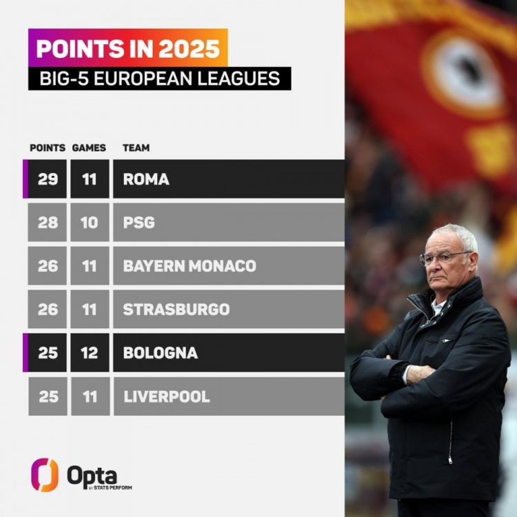 3月18日訊 國家隊(duì)比賽周來襲,五大聯(lián)賽暫時(shí)告一段落,OPTA也統(tǒng)計(jì)了2025年五大聯(lián)賽拿分情況,羅馬居首。
