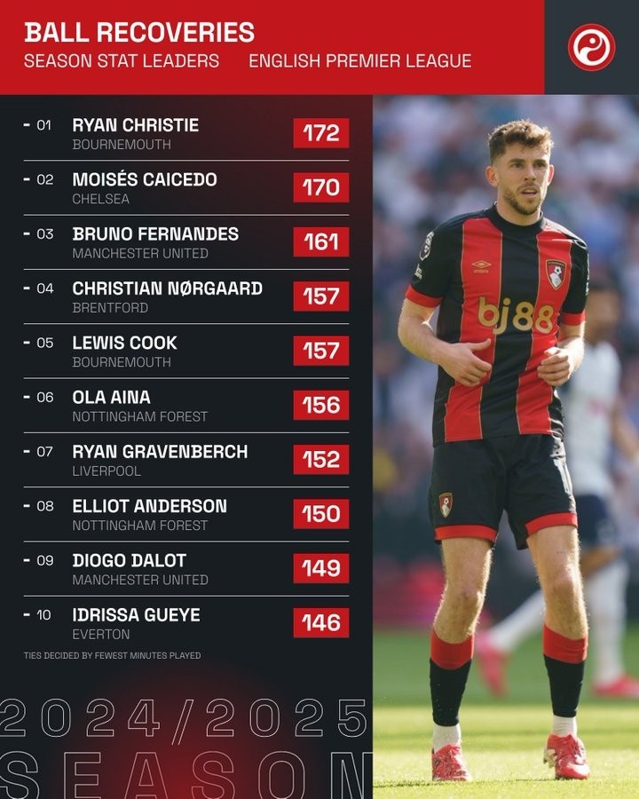 3月18日訊 國(guó)家隊(duì)比賽周到來(lái),英超也暫時(shí)告一段落,squakwa統(tǒng)計(jì)了本賽季英超贏得球權(quán)情況,克里斯蒂居首。