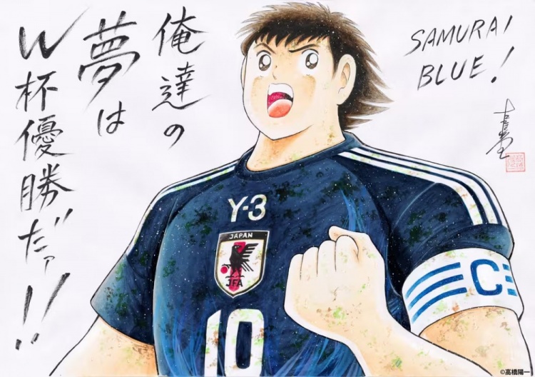 這是高橋陽一在3月世預賽期間特意為日本隊設計的應援插畫,插畫上是大空翼穿著日本國家隊球衣用力握拳的模樣,并寫著:“我們的夢想是世界杯冠軍!!”
