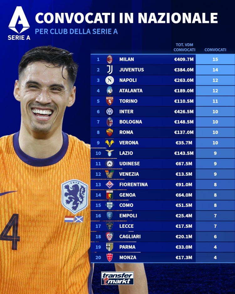 3月18日訊 德國轉會市場統(tǒng)計了意甲俱樂部被國家隊征召的球員人數(shù),并列出榜單,米蘭15人最多,尤文14人次席。