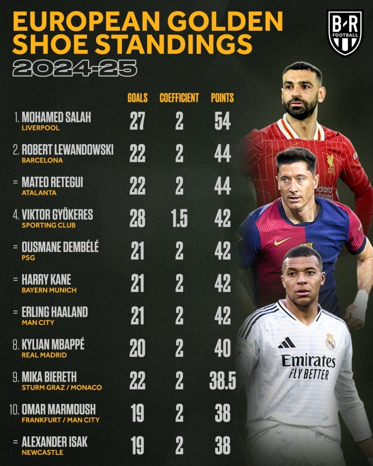 3月18日訊 B/R Fooball統(tǒng)計了本賽季球員的聯(lián)賽進球數(shù)量,并列出歐洲金靴排名,薩拉赫54分領跑,萊萬、雷特吉44分次席。