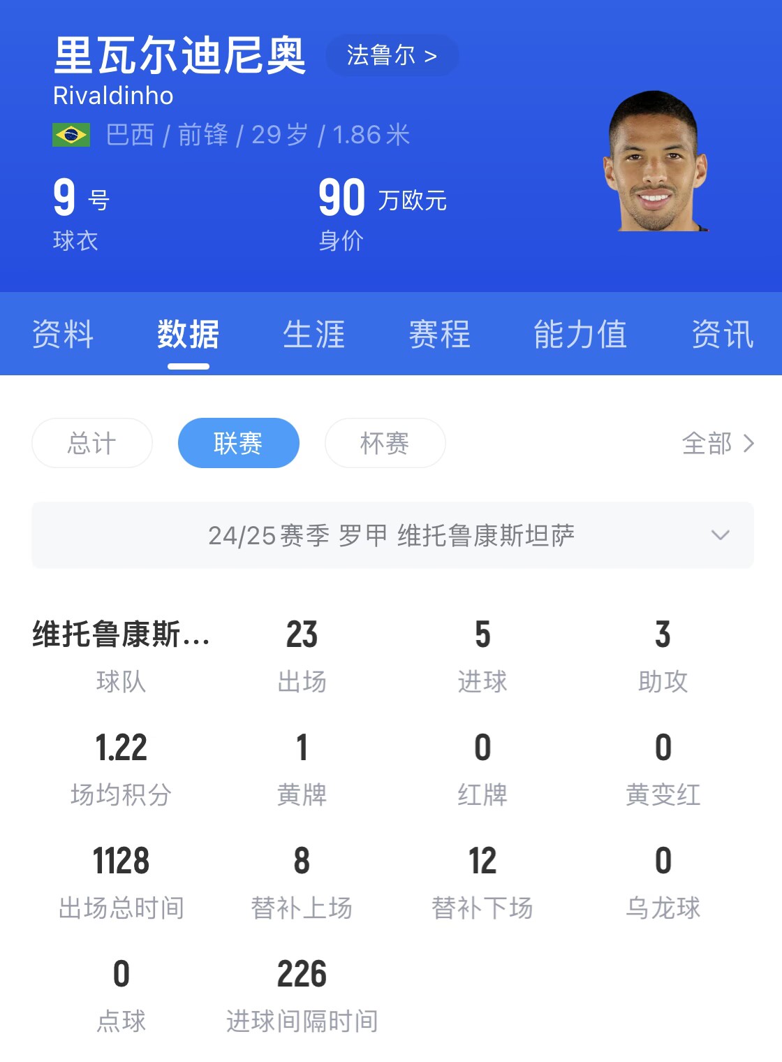 本賽季,里瓦爾迪尼奧聯(lián)賽出場23次,打入5球并有3次助攻,球隊(duì)排名聯(lián)賽第11位。