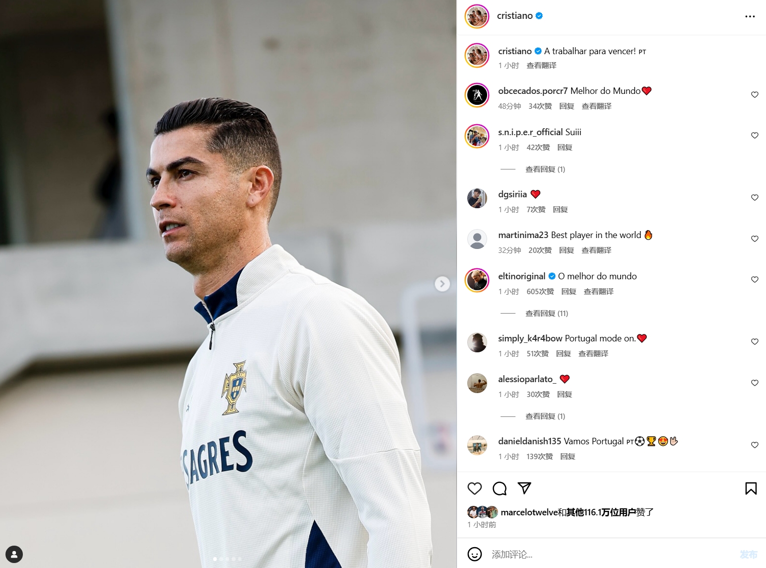 3月19日訊 不久前,正在葡萄牙國家隊(duì)備戰(zhàn)的C羅更新了社交媒體。