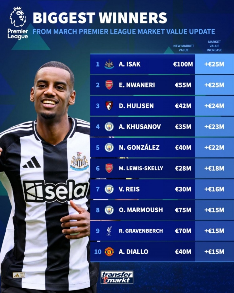 3月19日訊 《轉(zhuǎn)會市場》更新了英超球員身價,并列出了本期球員身價上漲榜單,曼城4名新援均上榜。