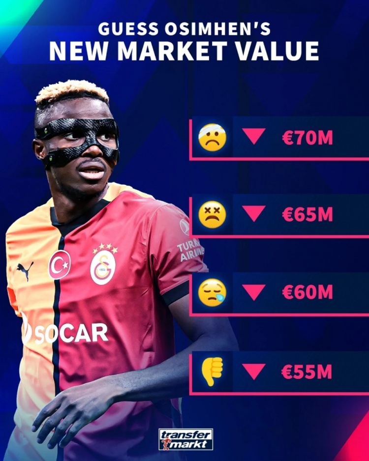 奧斯梅恩目前的德轉(zhuǎn)身價(jià)為7500萬歐元,根據(jù)德轉(zhuǎn)的預(yù)熱圖片,他的身價(jià)確定下跌,最新身價(jià)可能為7000萬歐、6500萬歐、6000萬歐或5500萬歐。