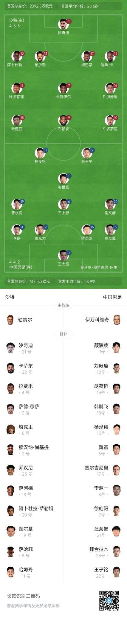 沙特替補(bǔ):21-哈米德-尚基提、22-艾哈邁德-卡薩爾、2-穆漢納-尚基提、3-薩阿德-穆薩、4-阿里-拉賈米、5-吉哈德-薩克里、23-齊亞德-喬漢尼、8-馬爾萬-薩哈菲、11-阿卜杜拉-哈姆丹、18-穆哈納德-薩阿德、19-圖爾基-阿馬爾、20-阿卜杜拉-薩利姆