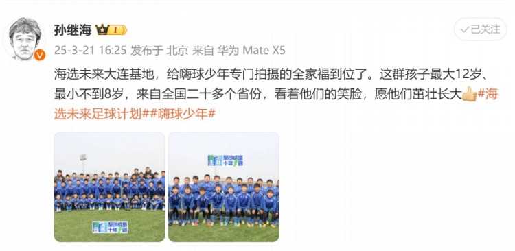 孫繼海寫(xiě)道:海選未來(lái)大連基地,給嗨球少年專(zhuān)門(mén)拍攝的全家福到位了。這群孩子最大12歲、最小不到8歲,來(lái)自全國(guó)二十多個(gè)省份,看著他們的笑臉,愿他們茁壯長(zhǎng)大。