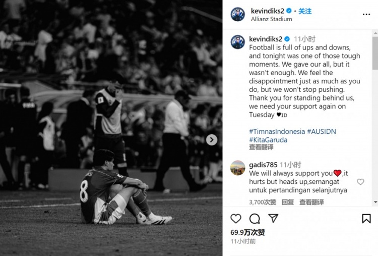3月21日訊 印尼球員迪克斯更新社媒,發(fā)文總結印尼1-5不敵澳大利亞的比賽。