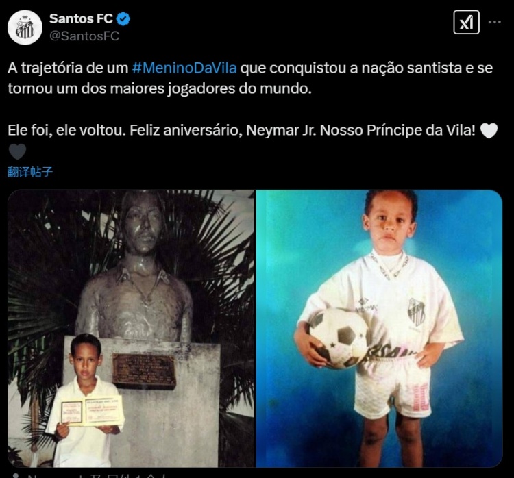 桑托斯曬出了內(nèi)馬爾兒時身穿桑托斯球衣的照片,并配文:“我們的鄉(xiāng)村男孩的過往軌跡,他征服了桑托斯并成為了世界最佳之一。他離開過,他又回來了。生日快樂,內(nèi)馬爾。我們的王子!”