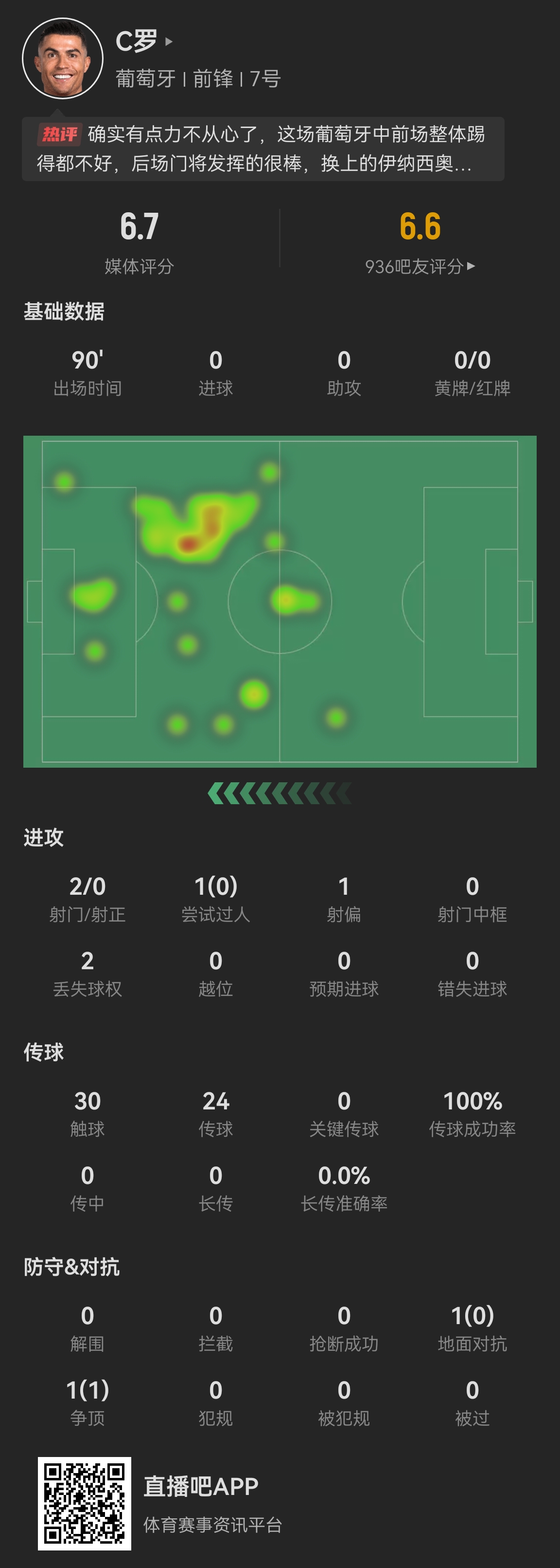 03月21日訊 歐國聯(lián)1/4決賽首回合,葡萄牙客場0-1不敵丹麥。40歲的C羅首發(fā)出場,打滿了全場,觸球30次,獲評6.7分,這兩項數(shù)據(jù)均為葡萄牙首發(fā)球員最低。 標簽: 足球 C羅 葡萄牙 丹麥