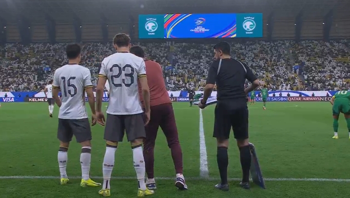 小動作,沙特球員與張玉寧對抗后,踩了一腳倒地的張玉寧