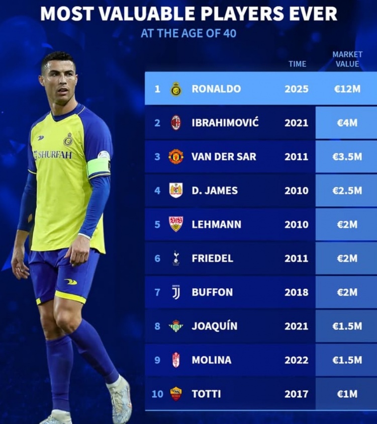 2月5日訊 C羅在今日迎來40歲生日,《轉(zhuǎn)會(huì)市場》也列出了40歲球員歷史身價(jià)最貴榜單,C羅無懸念居首。