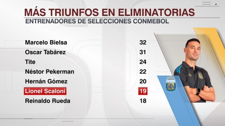 據(jù)ESPN統(tǒng)計(jì),此役是斯卡洛尼帶領(lǐng)阿根廷隊(duì)在南美世預(yù)賽取得的第19場勝利,世預(yù)賽勝場數(shù)排名南美國家隊(duì)主帥第6位。