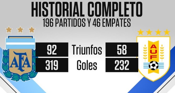 據(jù)統(tǒng)計,這是阿根廷與烏拉圭兩支南美老牌強隊歷史上第196次交鋒,阿根廷的戰(zhàn)績?yōu)?2勝46平58負(fù),打進319球,丟232球。