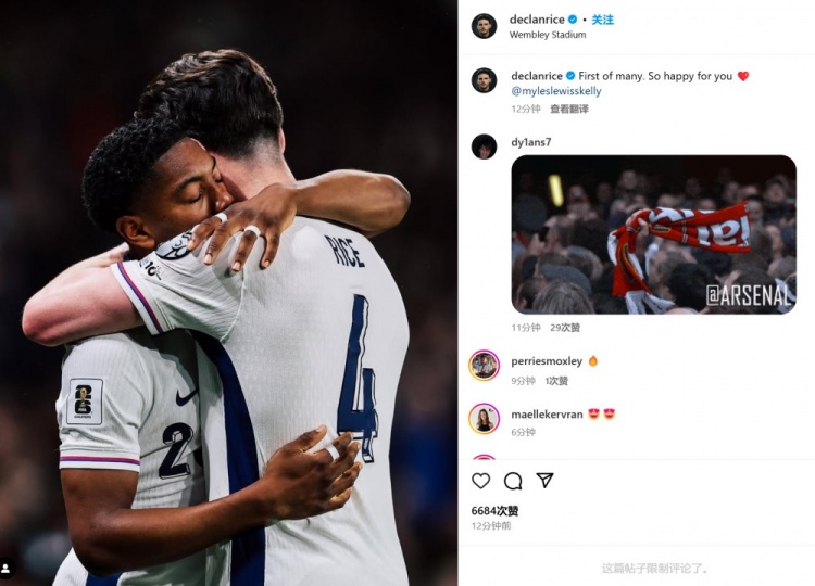 作為雙料隊(duì)友的老大哥賴斯也在賽后通過社媒曬出兩人的擁抱照,并配文:“未來眾多進(jìn)球里的第一個(gè)!我為你感到非常開心??@斯凱利”。