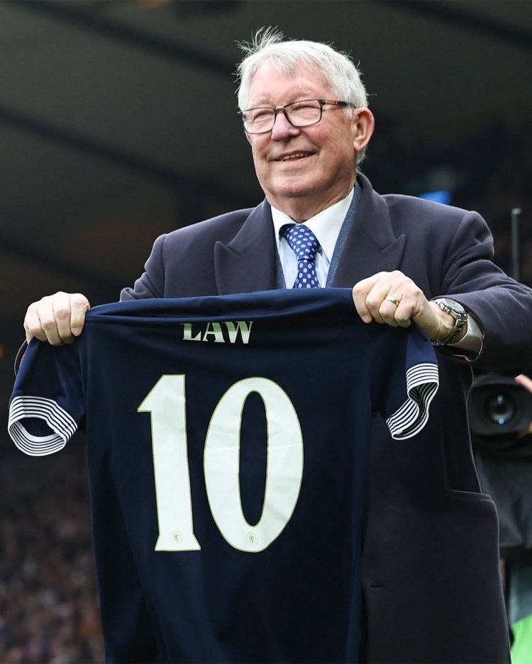 3月24日訊 當?shù)貢r間上周末蘇格蘭對陣希臘的歐國聯(lián)賽前,弗格森手持丹尼斯-勞蘇格蘭隊10號球衣,向其致以敬意。