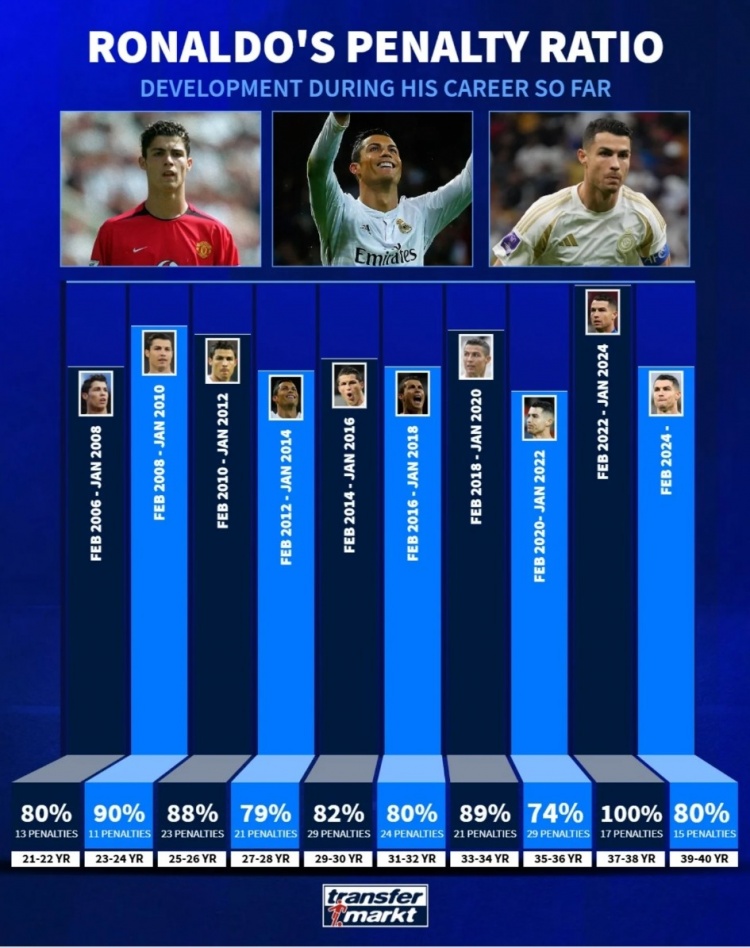 3月24日訊 德國轉會市場統(tǒng)計了C羅不同年齡段的點球命中率,并排出列表,C羅37到38歲點球命中率100%最高,39到40歲點球命中率80%。
