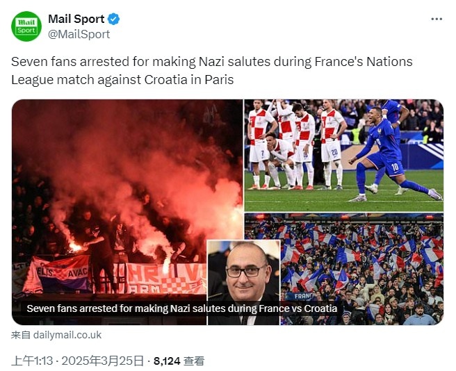 3月25日訊 《每日郵報(bào)》報(bào)道,巴黎當(dāng)局證實(shí),七名在法國vs克羅地亞的歐國聯(lián)比賽中行納粹禮的球迷已被拘留。