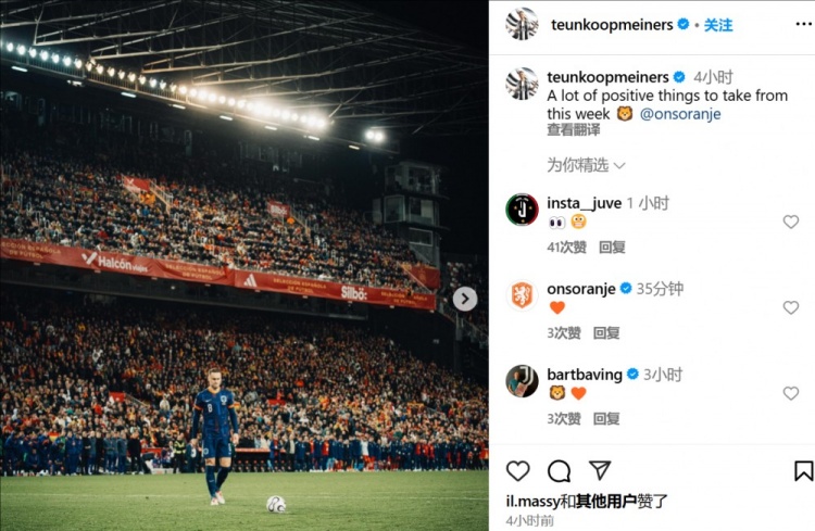 庫普梅納斯在社交媒體上寫道:“這一周發(fā)生了許多積極的事情?!闭б豢此坪跏菍δ陌抵S,但庫普梅納斯標(biāo)注了荷蘭隊(duì),并且配圖也是荷蘭國家隊(duì)的賽場照,因此可以認(rèn)為他是在談?wù)摵商m的歐國聯(lián)之旅。
